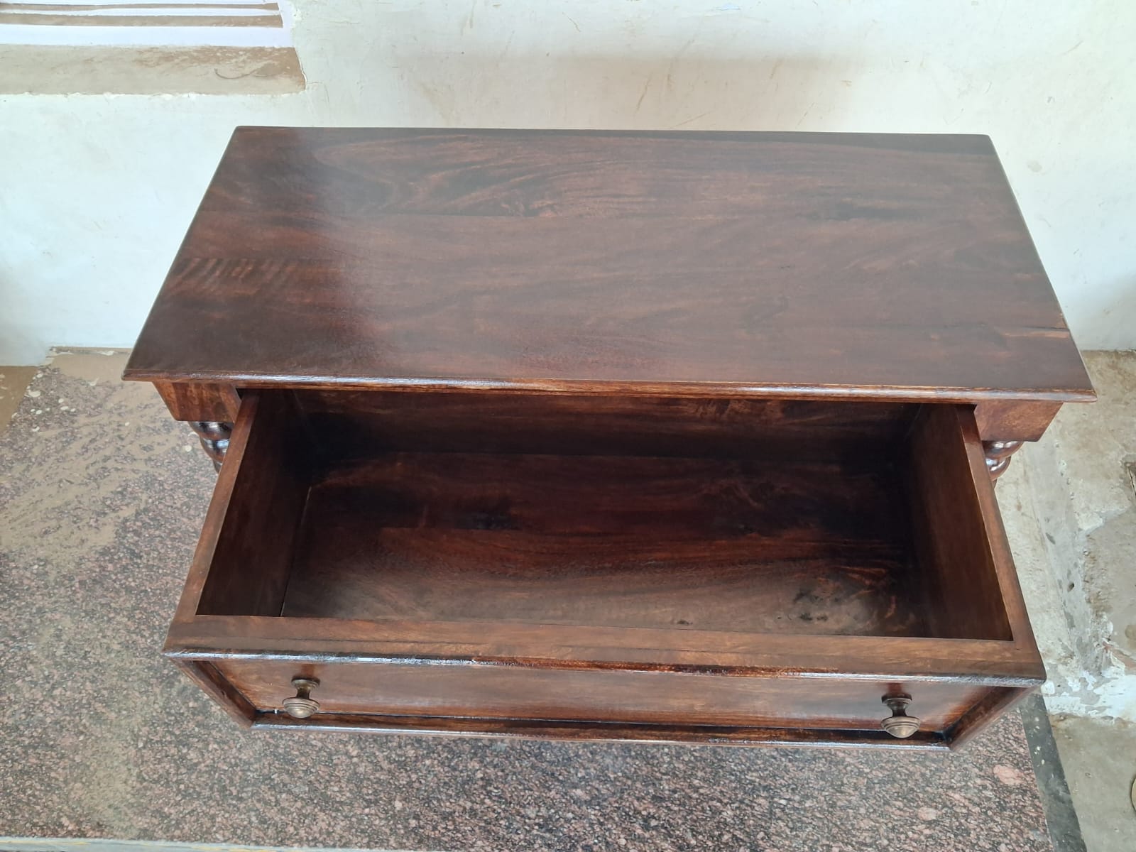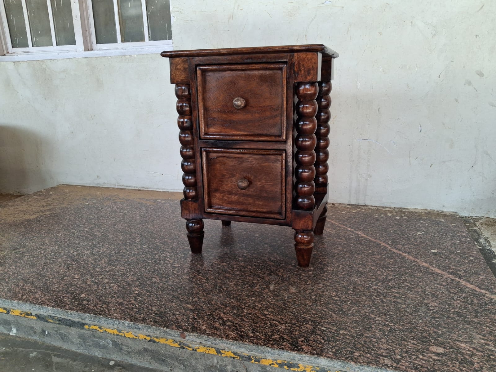 Our artisans love turning solid wood into heirloom pieces. Consider this charming two-drawer bedside table. Hand-turned bobbin legs give it classic rustic appeal. The rich walnut-like finish shows off the natural grain. Drawers slide smoothly. Simple brass knobs add elegance. The table measures about 40-50cm wide. It's compact. Yet it's sturdy. So it fits perfectly beside a bed. You can store books, lamps, or morning coffee there.
