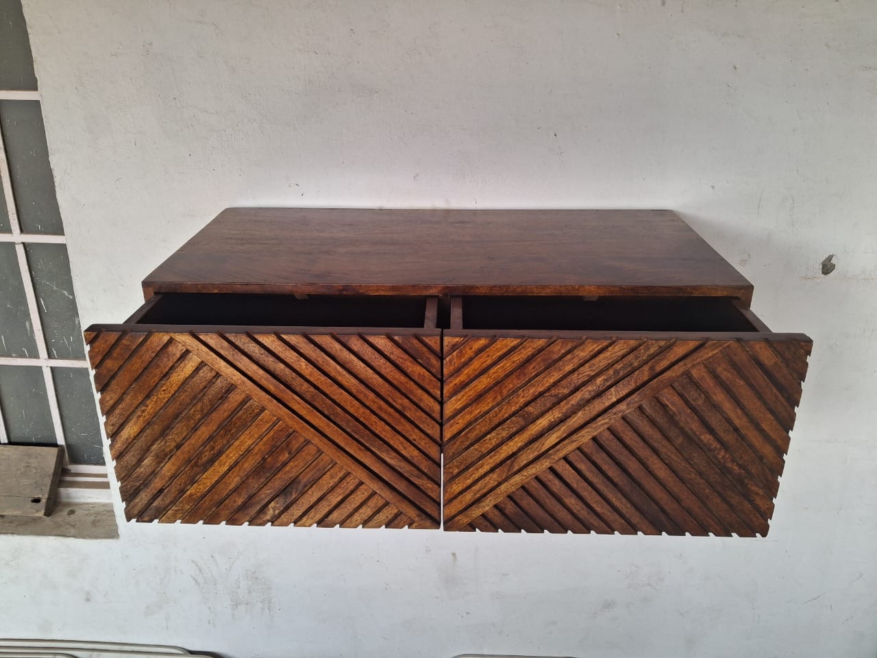Do you want a contemporary touch? Our hand-carved geometric bathroom vanity stands out. Artisans carve a striking chevron pattern by hand. This creates movement and texture. Light dances across it beautifully in any bathroom. The piece splits into two sections with a clean join. Hidden storage sits behind artistic fronts. So you can tuck away toiletries, towels, or essentials neatly. At the same time, it adds sophistication.