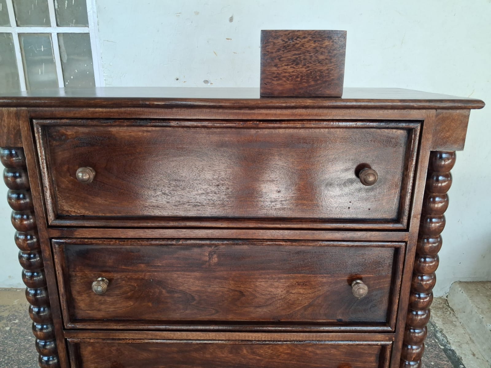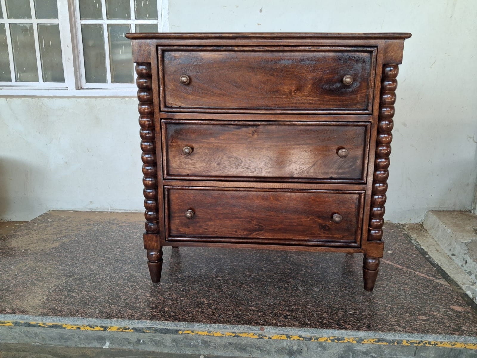 Bedrooms often need extra storage. However, space should not feel crowded. Our three-drawer chest solves that. Signature bobbin-turned legs create a vintage farmhouse look. A deep warm brown polish highlights the wood's depth. Drawers are generously sized. Dovetail construction ensures strength. Antique-style brass knobs feel comfortable in your hand.