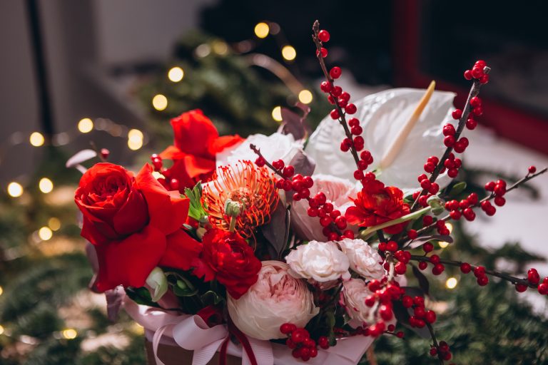 Fold napkins neatly and top them with holly, ilex berries, or a single bloom. Then, tie on name tags for a personal finish. As a result, each setting feels thoughtful and complete.
