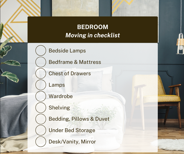 Your bedroom should be a sanctuary, giving you the comfort and rest you need from day one. Investing in a sturdy bedframe and a supportive, ergonomic mattress will set the foundation for a great night’s sleep. After that, it’s all about smart storage and keeping things organised.