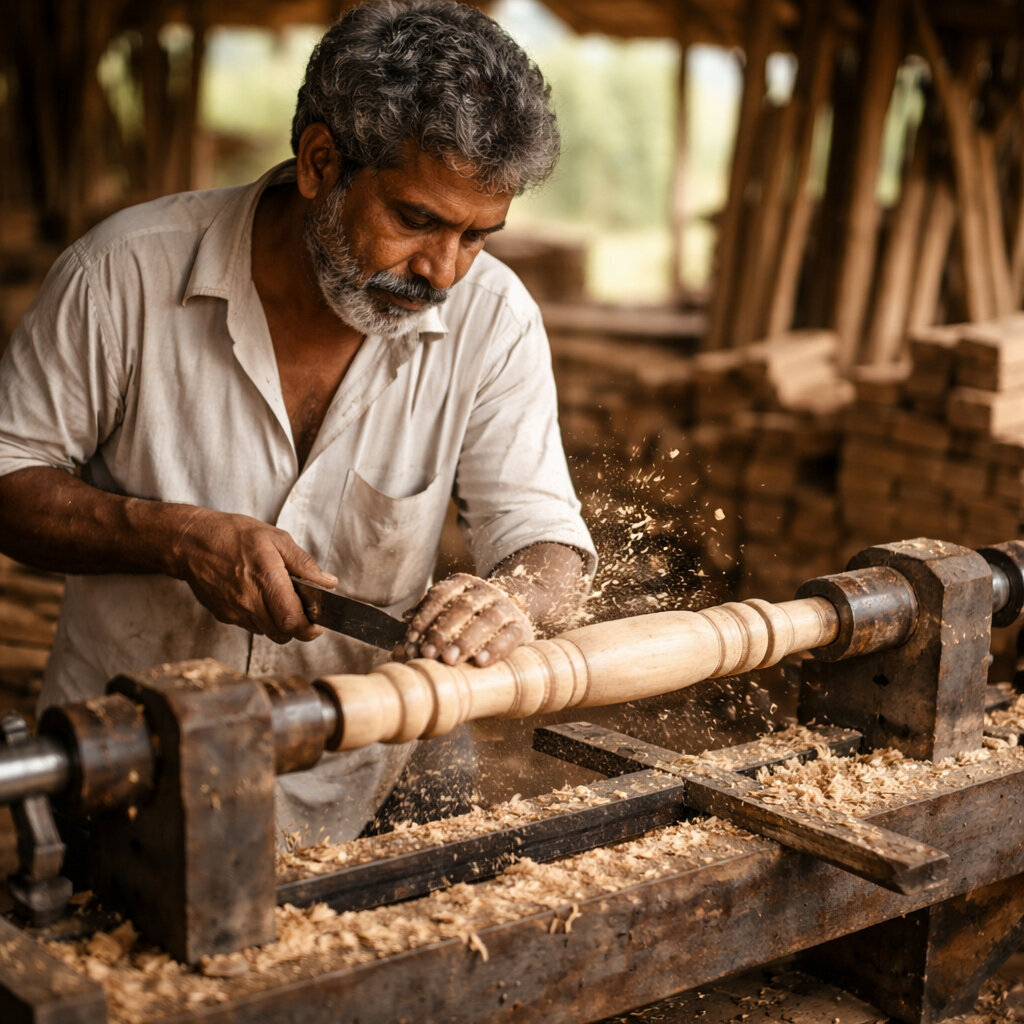 Each project starts with a careful evaluation of mango, sheesham, pine, oak, or acacia timber. Every plank is checked for moisture content, grain strength, and stability.