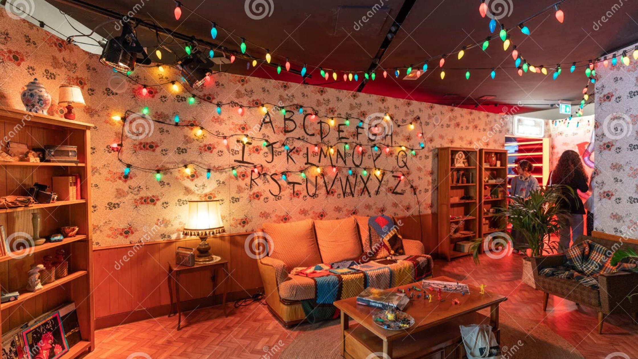 First, enter the Byers’ house. Dark and light wood panelling, cluttered shelves, and alphabet lights scream 1983. Next, the Wheeler basement: shag carpet, Dungeons and Dragons books, Atari joy.
