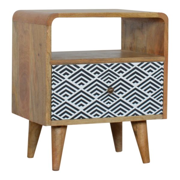 This oak toned bedside table is crafted from solid mango wood with a refined finish and features a black and white diamond print drawer front. Designed as an open slot bedside table, it includes a curved base and stands on Nordic-style legs, combining practical storage with striking, contemporary style for any bedroom.