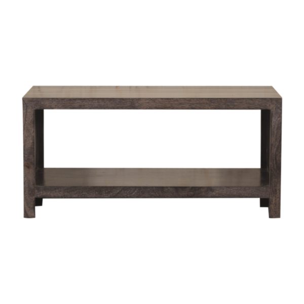 This chestnut coffee table is crafted from solid mango wood with a rich finish that highlights the natural grain. Designed as a coffee table with open shelf, it features a striking gold inlay design, providing stylish storage and a modern accent for any living room.