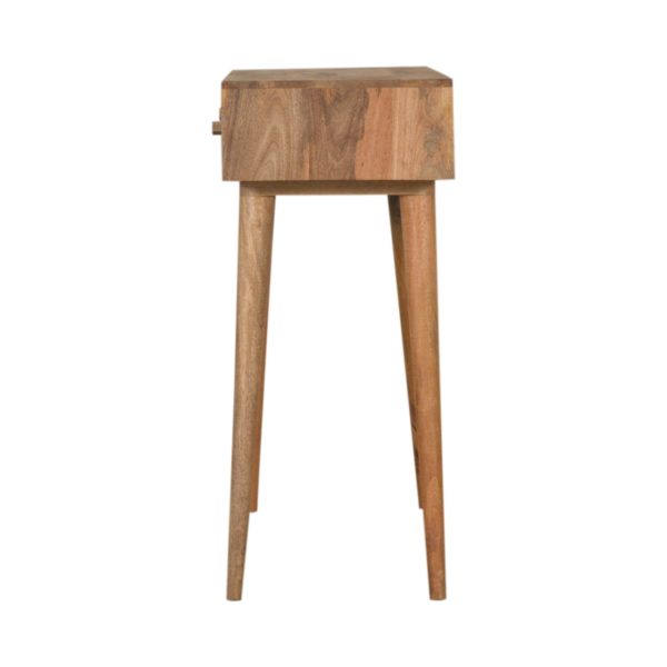 This oak toned console table is crafted from solid mango wood with a warm finish suited to modern interiors. It features two drawers with oak-toned and gold patterned fronts and stands on Nordic-style legs, making it a practical patterned drawer console table that blends Art Deco flair with functional storage.
