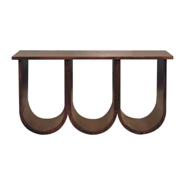 This chestnut coffee table is crafted from solid mango wood with a rich chestnut finish that highlights its natural grain. Designed as both an Art Deco coffee table and a coffee table with open compartments, it features three spacious open areas for practical storage while adding bold, artistic flair to any living room.