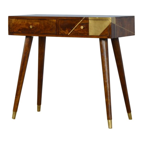 This chestnut console table is crafted from solid mango wood in a warm finish that suits a range of interiors. It offers two drawers with gold geometric brass fronts and brass knobs for easy access, standing on slim Scandi-style legs with metallic tips for a refined look, making it a striking gold geometric console table for practical workspace or storage.