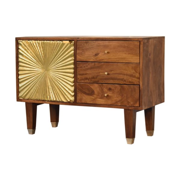 This chestnut sideboard is crafted from solid mango wood with a deep chestnut finish, combining elegant design with practical storage. Featuring a brass-plated cabinet, three drawers with polished knobs, and tapered legs with brass-capped feet, this tapered leg sideboard also functions as a brass-accented sideboard, offering a sophisticated and stylish addition to any home.