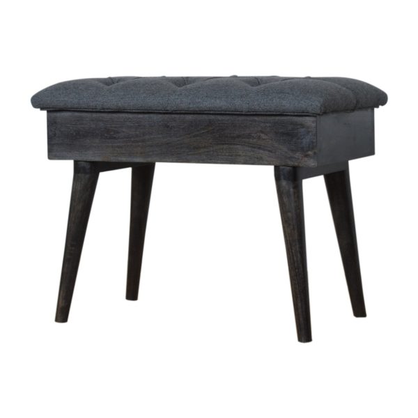 This tweed storage bench features a charcoal tweed upholstered top with deep-button detailing and ash-black wooden legs for sturdy support. As a wooden leg bench, it blends comfort and timeless sophistication, ideal for dining areas, hallways, or bedrooms.