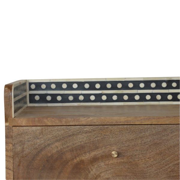This oak toned bedside table is crafted from solid mango wood and designed to bring elegant detail to any bedroom. Styled as a bone inlay bedside table, it features three drawers with cylindrical knobs, a decorative bone inlay gallery back, and Nordic-style legs, offering practical storage with refined, ethical craftsmanship.