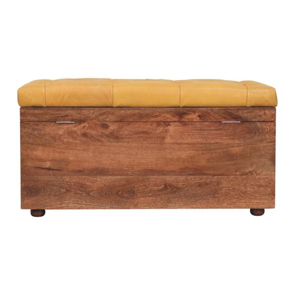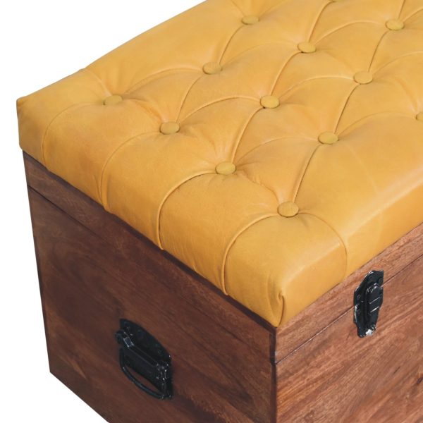 This buffalo hide storage trunk is upholstered in rich honey caramel buffalo leather, featuring a deep buttoned design that adds comfort and visual appeal. Designed with a discreet internal compartment, it provides practical hidden storage for household essentials. As a buttoned leather storage trunk, it works beautifully in hallways or bedrooms, combining everyday functionality with a refined, timeless look.