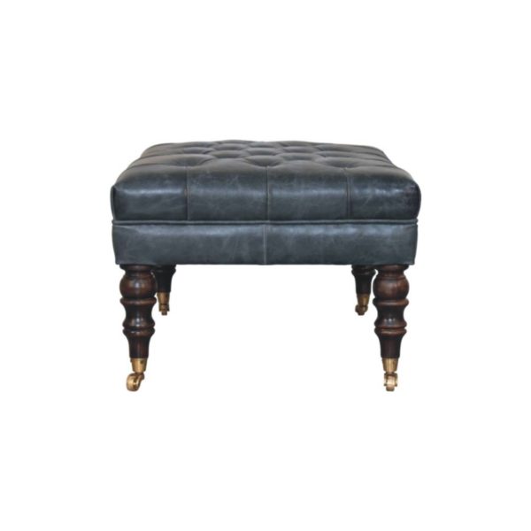This buffalo leather bench is crafted from solid mango wood with walnut-toned sculpted legs, showcasing a hand-tufted teal leather seat. Designed as a walnut bench and ottoman bench, it features brass casters for mobility, combining vintage elegance with practical, versatile seating for any lounge, bedroom, or foyer.