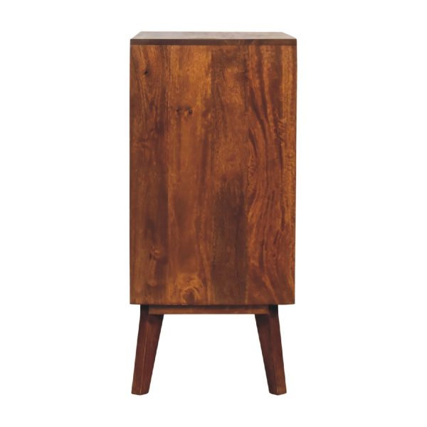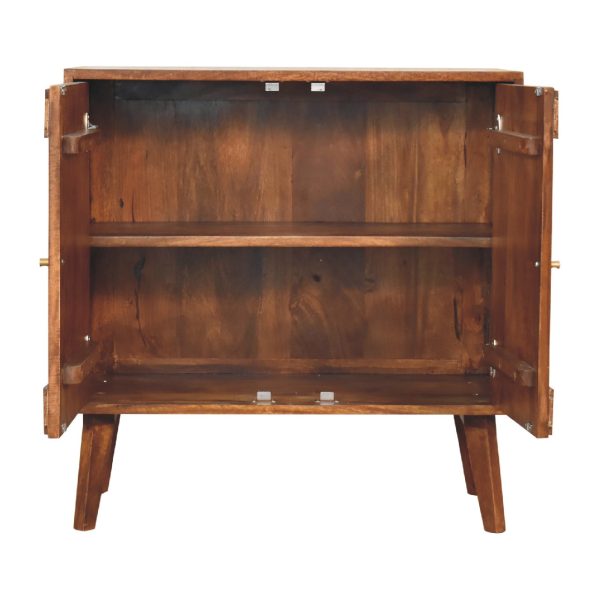 This chestnut cabinet is crafted from solid mango wood, offering practical storage with interior shelves and a spacious top surface. Designed as a carved cabinet with smooth sliding doors and sleek brass knobs, it combines elegant detailing with functional storage, adding style and sophistication to any room.
