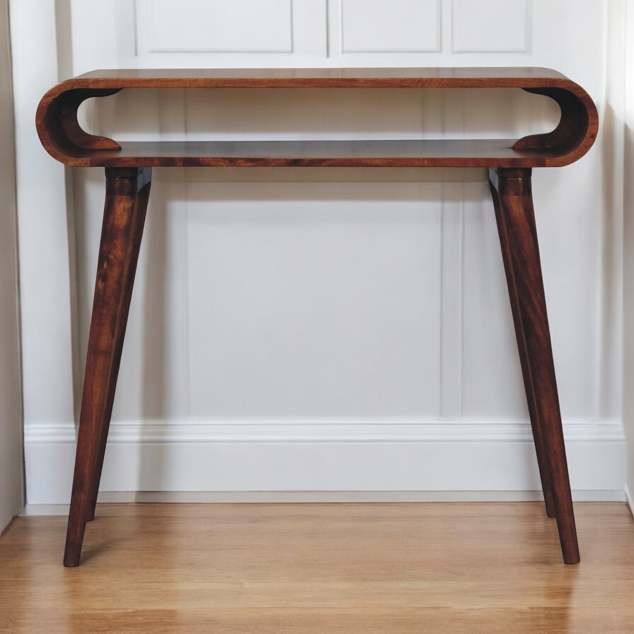 This chestnut wall mounted console table is crafted from solid mango wood with a rich finish that brings warmth and character to your space. Designed in a clean scandi style, it features a generous drawer with vintage brass shell handles for practical everyday storage. As a scandi style console table, its floating, wall-mounted design helps maximise space while adding an elegant and functional touch to entryways or living rooms.