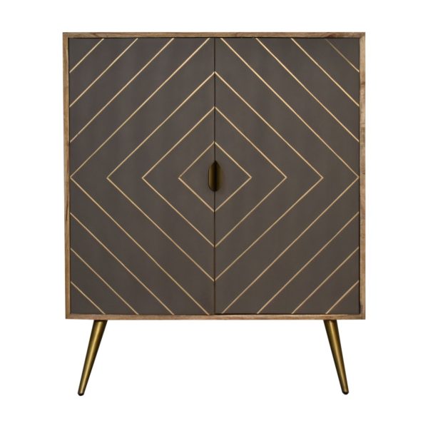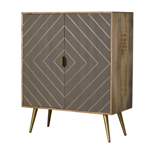 This oak toned cabinet is crafted from solid mango wood with an oak-like finish, combining contemporary style with practical storage. Featuring grey cement doors and golden brass inlay, this Art Deco cabinet also functions as a brass inlay cabinet, offering multiple compartments to keep your home organised while adding a stylish, modern touch.
