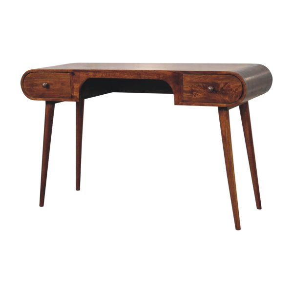 This chestnut writing desk is handcrafted from solid mango wood with a rich finish, featuring two drawers, rounded edges, and a comfortable seating cut-out. As an open slot desk, it blends minimalist style with practical functionality, perfect for studies or living spaces.