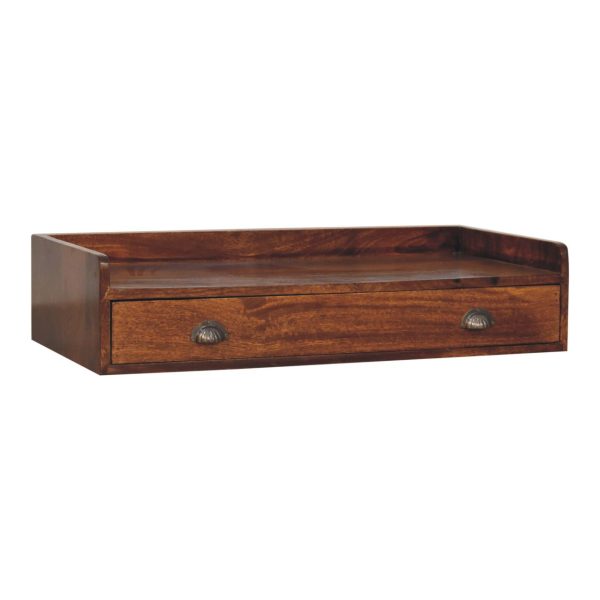 This chestnut wall mounted console shelf is crafted from solid mango wood, featuring a warm finish that highlights the natural grain. A spacious drawer with vintage-style brass shell handles offers practical storage, while the floating design frees up floor space and keeps the look clean and modern. Ideal for entryways, living rooms or compact layouts, this console brings refined character and everyday functionality to your home.