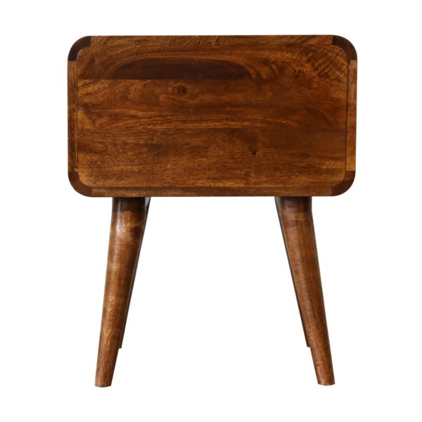 This chestnut bedside table is crafted from solid mango wood with a warm finish, combining timeless style with practical storage. Designed as a curved bedside table, it features smooth rounded edges, two spacious drawers with shiny knobs, and Nordic-style legs, offering both elegance and functionality for any bedroom or living space.