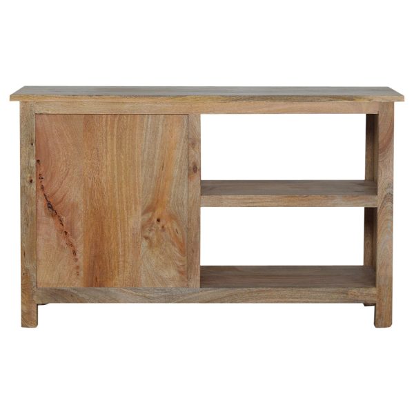 This oak toned tv unit is crafted from solid mango wood with a smooth oak-like finish. Featuring three drawers and backless shelves for easy wire management, it provides practical storage for media and décor. The farmhouse tv unit design combines rustic charm with functional organisation, making it a stylish addition to any living space.