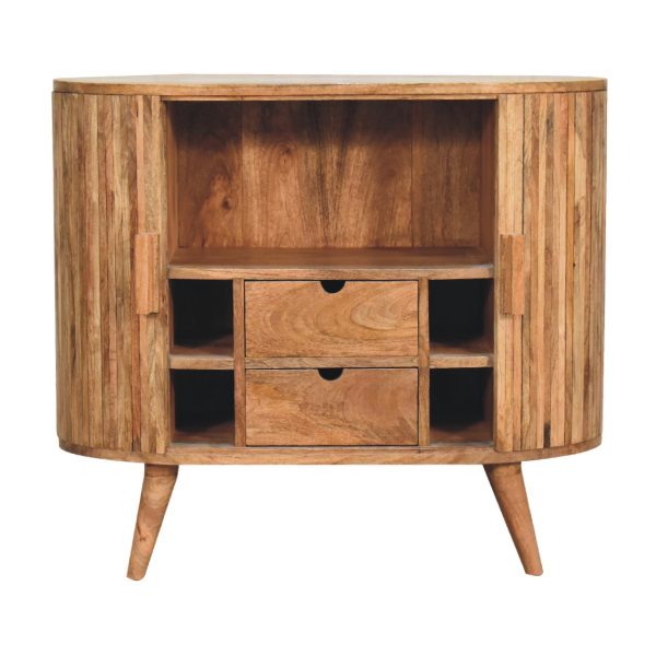 This oak toned cabinet is crafted from solid mango wood with a sleek chestnut finish, combining modern style with practical storage. Featuring striped doors, shelves, and drawers, this striped door cabinet also functions as a cabinet with shelves and drawers, providing organised and versatile storage for drinks, books, plates, and more in any room.