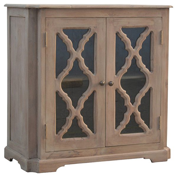 This sun bleached sideboard is crafted from solid mango wood with a sleek finish that highlights its carved details. Designed as a carved glazed sideboard, it features two glazed door cabinets, round metal knobs, and a sturdy plinth base, offering elegant and practical storage for living or dining spaces.