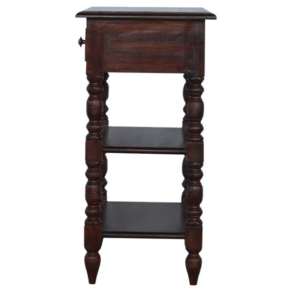 This cherry console table features a drawer and two open shelves, combining practical storage with rustic elegance. Designed as a hallway or room console table, it enhances interiors with handcrafted quality, turned legs, and a warm cherry finish, providing both functionality and timeless charm.