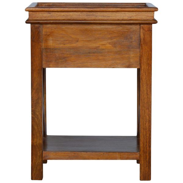This chestnut end table features a pull-out drawer, open shelf, and criss-cross side panels, combining practical storage with artisanal craftsmanship. Designed as a country-style end table, it enhances any space with solid wood construction, handcrafted quality, and timeless elegance.