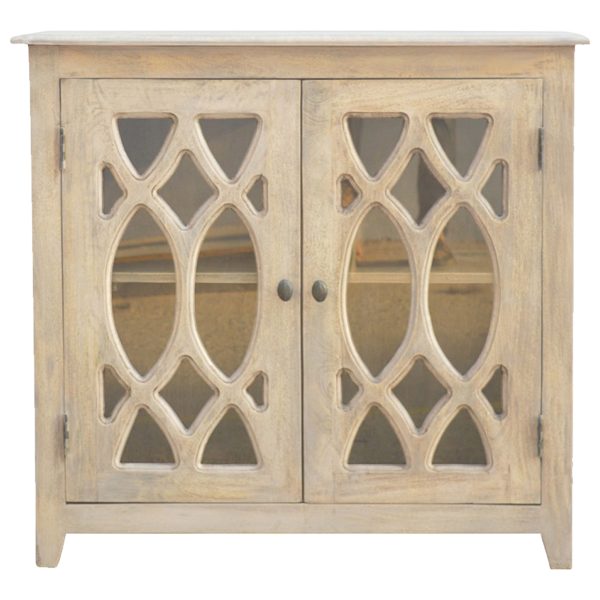 This stone wash sideboard is crafted from solid mango wood with an acid-washed finish that highlights its carved details. Designed as a carved sideboard, it offers six open slots, three drawers, and glazed door cabinets, providing stylish and practical storage for living or dining spaces.