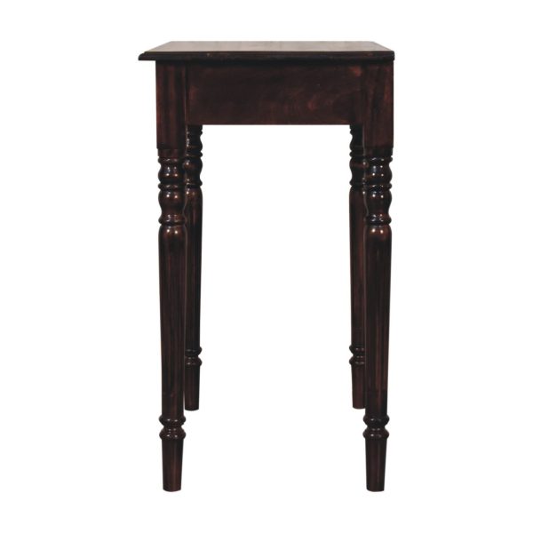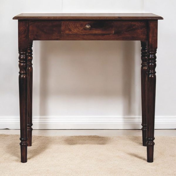 This walnut writing desk is crafted from solid mango wood, featuring a California walnut stained top and base for a refined, timeless look. Designed in a French style, it includes a single drawer with shell handles and beautifully hand-carved flute legs that add vintage character. As a french style writing desk, it blends decorative detailing with practical function, making it a stylish addition to home offices or living spaces.