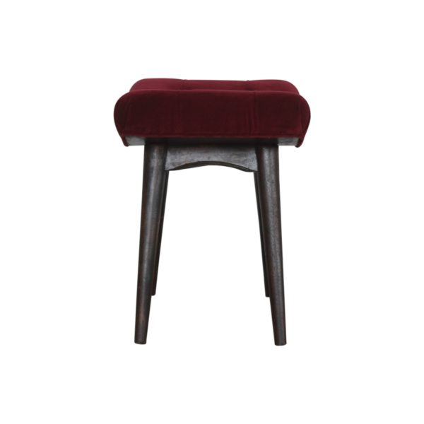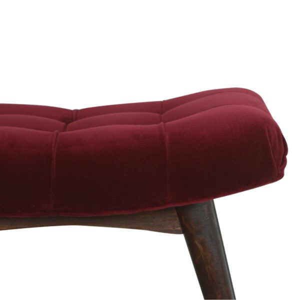 This dark red velvet bench features a plush curved seat crafted from cotton velvet for comfort and style. Supported by walnut-toned mango wood legs, this Scandi style bench adds elegance and practical seating to bedrooms, entryways, or living spaces.