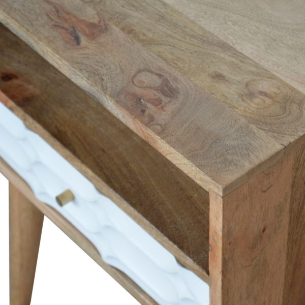 This oak toned bedside table is crafted from solid mango wood and designed to bring timeless charm to any bedroom. Styled as a hand-carved bedside table, it features two white hand-painted ellipse-shaped drawers and Nordic-style legs, offering practical storage while adding an elegant decorative touch.