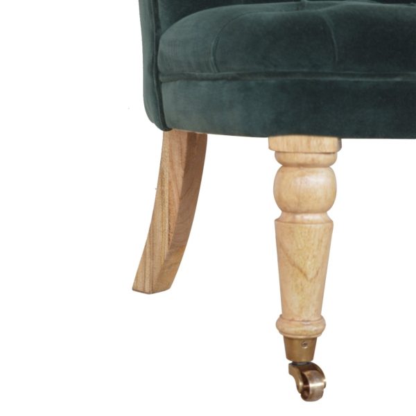 This emerald velvet accent chair is upholstered in soft cotton velvet with deep button tufting for a refined, vintage-inspired finish. Designed as a tufted accent chair and caster leg accent chair, it features a solid mango wood frame with hand-carved details, front castors for easy movement, tapered rear legs, and a warm oak toned finish, combining elegance, style, and eco-conscious craftsmanship.