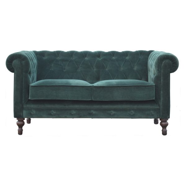 This Emerald Green Velvet Chesterfield Sofa is a luxurious two-seater that exudes bold elegance and classic Chesterfield sophistication. Upholstered in rich emerald velvet, it features deep button tufting, refined piping, and enveloping sheltering arms for ultimate comfort. Crafted from solid, sustainably sourced mango wood and supported by four hand-turned walnut legs, this fully assembled sofa serves as a striking focal point, complementing both modern and traditional interiors with timeless style and vibrant charm.
