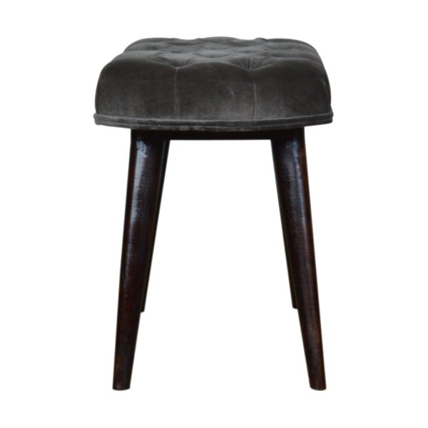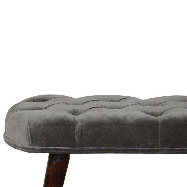 This grey velvet bench features a soft, deep-tufted seat crafted from cotton velvet for comfort and style. Supported by walnut-toned mango wood legs, this Scandi style bench adds elegance to bedrooms, entryways, or living spaces while providing practical, refined seating.