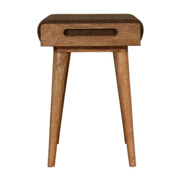 This multi-tweed footstool features a flat tray-style top and solid Scandi-style walnut legs. Fully assembled, it serves as a comfortable seat, accent piece, or occasional stool, blending vibrant fabric with sturdy construction to enhance any modern bedroom, lounge, or living space.