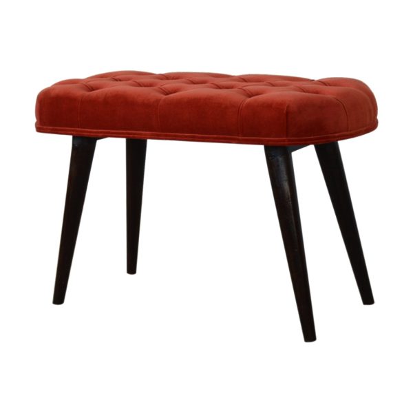 This red velvet bench features a soft, deep-tufted seat crafted from cotton velvet for comfort and style. Supported by walnut-toned mango wood legs, this Scandi style bench adds elegance to bedrooms, entryways, or living spaces while providing practical, refined seating.