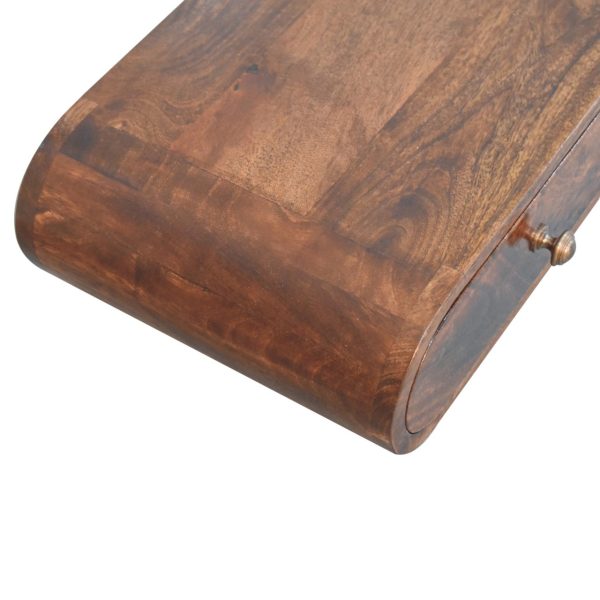 This walnut floating console table is crafted from solid mango wood in a rich California walnut finish, featuring a smooth curved design for a modern look. Its wall-mounted, legless construction makes it a practical space-saving solution, while two drawers provide convenient storage for everyday items. As a curved floating console table, it also offers a spacious surface for displaying books, plants or decorative pieces in living rooms or hallways.
