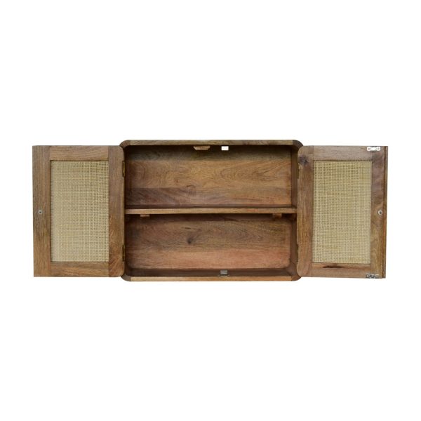 This grey wash wall cabinet is crafted from solid mango wood, featuring a sleek finish that complements modern interiors. Designed as a woven door cabinet, it includes spacious drawers with brass knobs and a built-in wall-mounting bracket, offering practical floating storage with a clean, Nordic-inspired look.