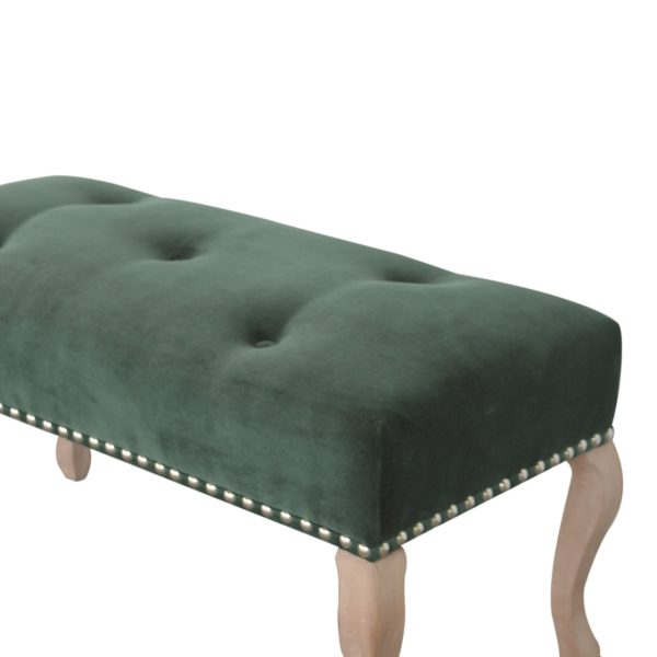 This emerald velvet bench features a plush deep-tufted seat on intricately sculpted French-style mango wood legs. Perfect for bedrooms, entryways, or living spaces, it provides luxurious seating while functioning as a tufted velvet bench that combines French elegance with durable, stylish design.