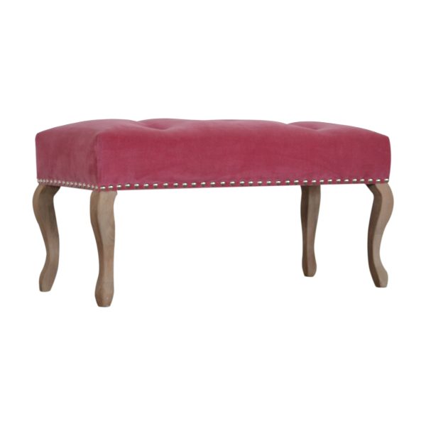 This pink velvet bench features a plush deep-tufted seat on sculpted French-style mango wood legs. Ideal for bedrooms, entryways, or living spaces, it offers elegant seating while functioning as a tufted velvet bench that blends classic detailing with durable design.