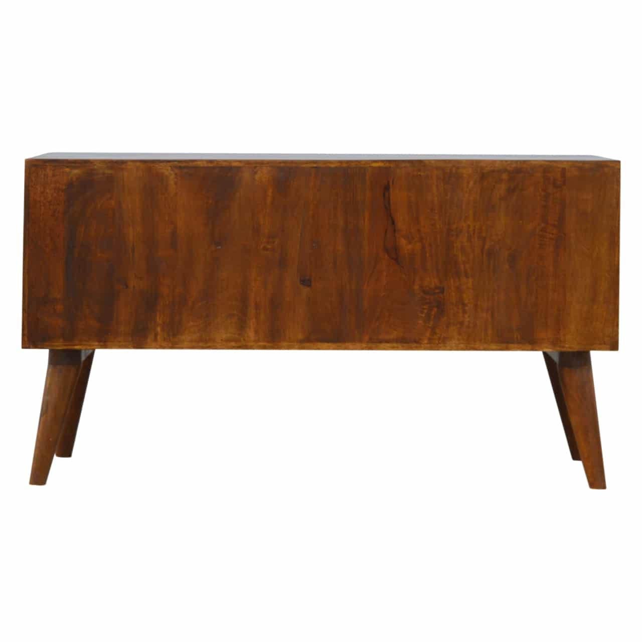 This chestnut sideboard is crafted from solid mango wood with a rich chestnut finish, combining practical storage with Art Deco elegance. Featuring gold geometric door design and brass knobs, this Art Deco sideboard also functions as a gold geometric sideboard, providing a stylish and durable addition to any living space.