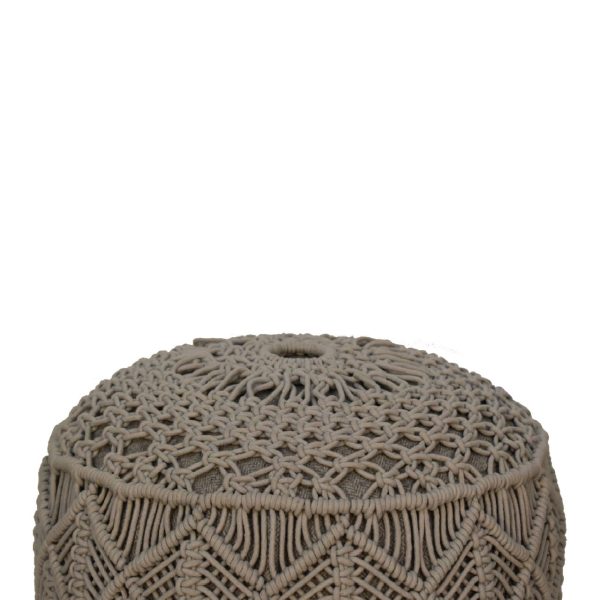 This grey crochet footstool features a braided cotton top and solid Scandi-style legs. Fully assembled, it provides a comfortable footrest, extra seating, or stylish accent, blending modern-boho charm with clean, contemporary design for any bedroom, lounge, or living space.