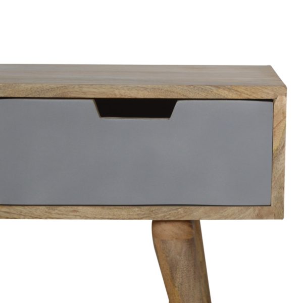 This oak toned tv unit is crafted from solid mango wood with an oak-like finish. Featuring hand-sprayed grey gradient drawers, Nordic-style feet, and a spacious top, it provides practical storage for media and décor. The grey drawer tv unit design combines contemporary style with functional organisation, making it ideal for modern living spaces.