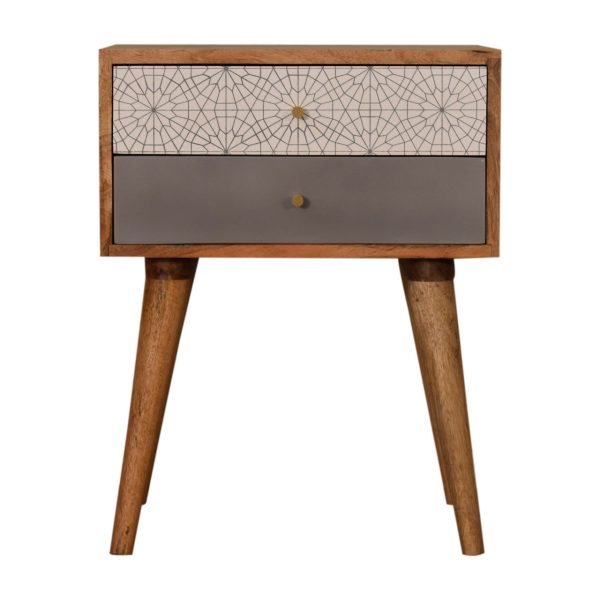 This patterned bedside table is crafted from solid mango wood with an oak toned finish for a modern, stylish look. Designed as a two drawer bedside table, it features one grey drawer and one patterned drawer, offering practical storage and a splash of colour and charm for any bedroom.