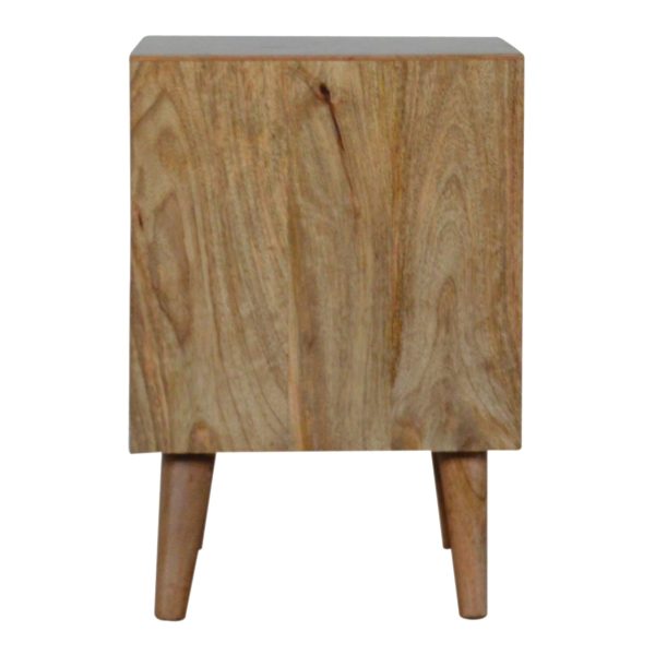 This oak toned bedside table is crafted from solid mango wood and designed to bring chic elegance to any bedroom. Styled as a hand-painted bedside table, it features two drawers in grey and white with open slot handles, supported by Nordic-style legs, offering practical storage with stylish appeal.