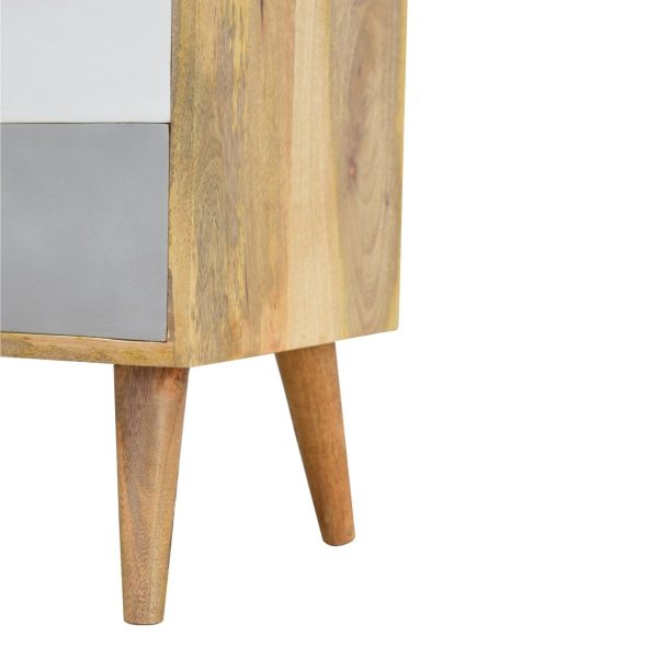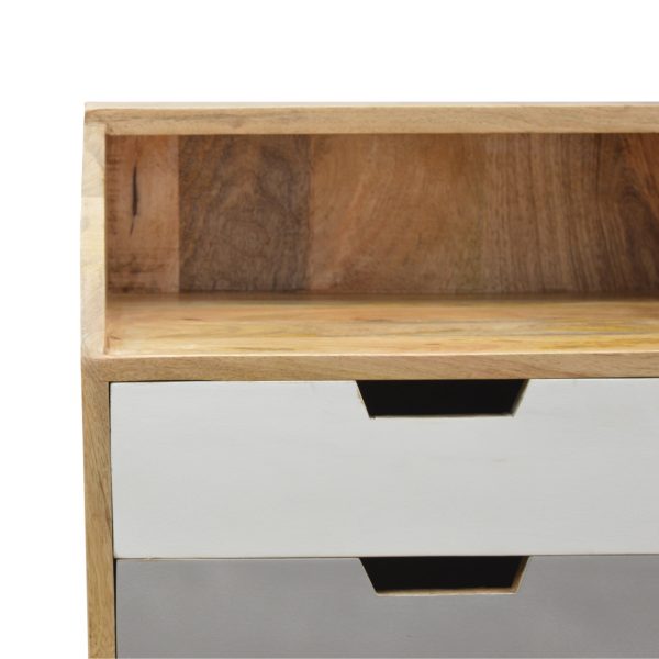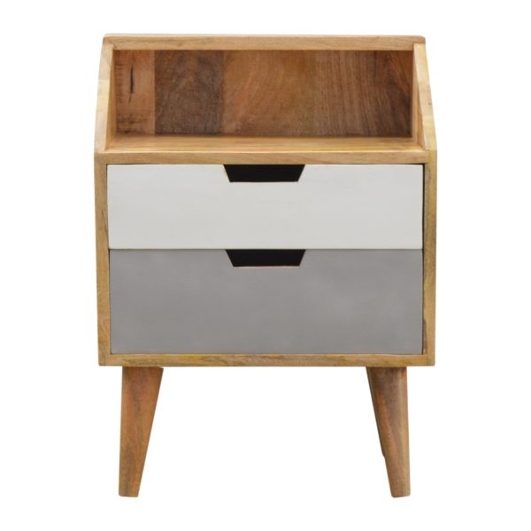 This oak toned bedside table is crafted from solid mango wood and designed to bring chic, practical storage to any bedroom. Styled as a hand-painted bedside table, it features two white and grey drawers, a raised open shelf, and Nordic-style legs with cut-out slots, offering both functionality and stylish appeal.
