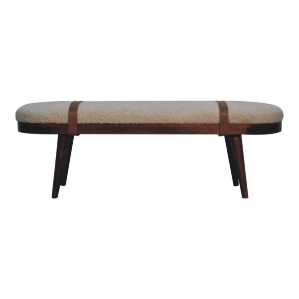This luxury boucle bench is crafted from solid mango wood with a rich walnut finish, inspired by clean scandi design and minimalist elegance. The plush cream bouclé seat adds softness and texture, creating a refined yet inviting look. Designed as a scandi luxury bench, its Nordic-style legs and streamlined form make it a versatile statement piece for hallways, bedrooms or living spaces.