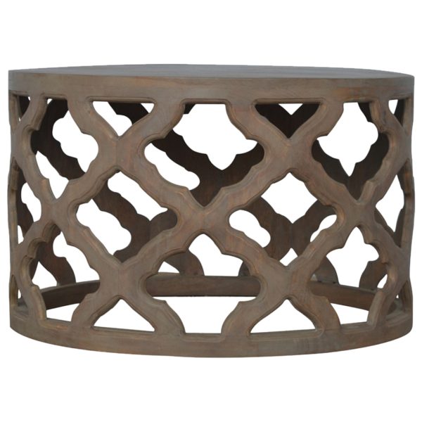 This grey floral stool features hand-carved detailing and a refined grey wash finish, combining elegant artistry with practical use. Designed as a round accent stool, it enhances any interior with timeless charm, versatile functionality, and handcrafted quality.