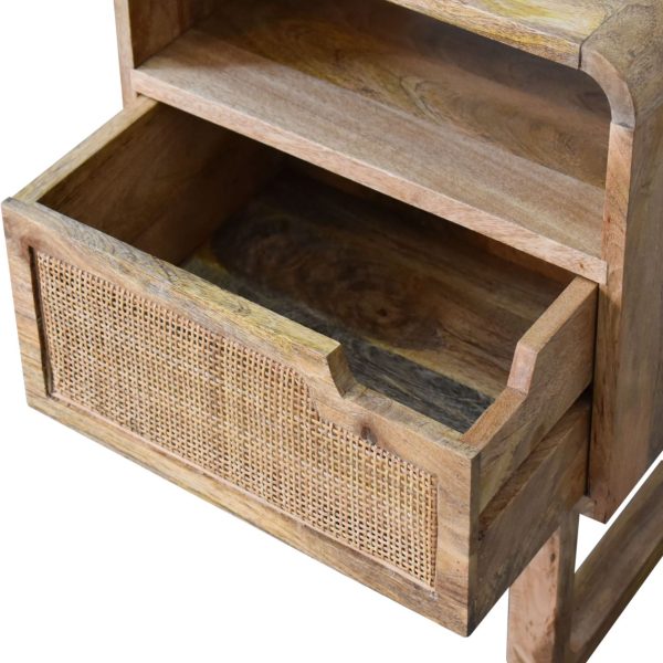 This oak-toned bedside table is crafted from solid mango wood and features a woven rattan drawer front that adds natural texture and charm. Designed as a woven drawer bedside table, it includes an open slot for extra storage and sleek U-shaped legs, creating a practical and modern addition to any bedroom.